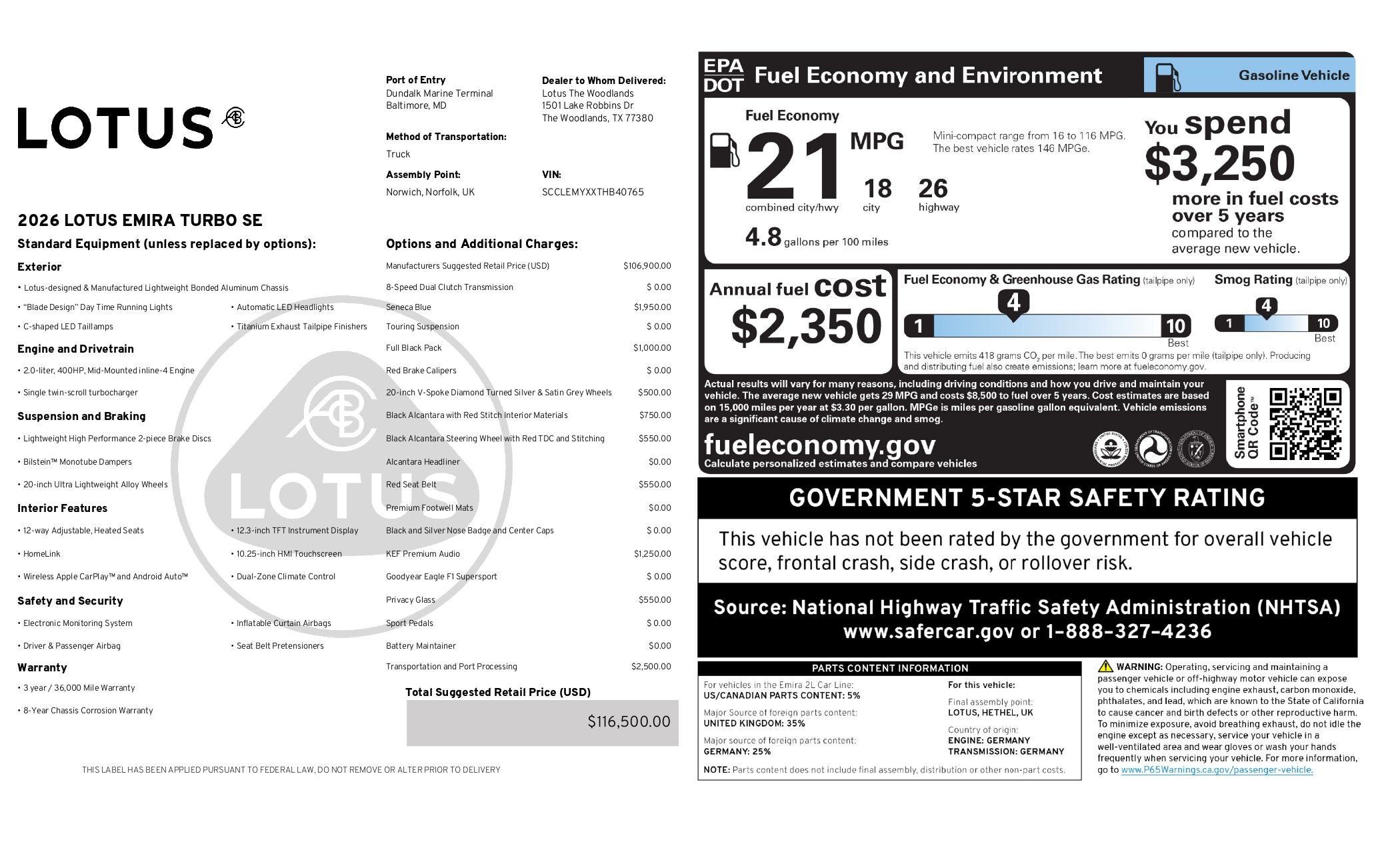 2026 Lotus Emira Turbo SE presented by Lotus Of The Woodlands. Seneca Blue Exterior with Black Interior, this Emira features Touring Suspension, Full Black Pack, Red Brake Calipers, 20 V-Spoke Diamond Turned Silver and Satin Grey Wheels, Privacy Glass, Black Alcantara Steering Wheel with Red Stitch, Alcantara Headliner, Red Seat Belts, Premium Footwell Mats, Black and Silver Nose Badge and Center Caps and KEF Premium Audio System.About Post Oak Motor Cars:Post Oak Motor Cars, a Fertitta Automotive Company, proudly represents Bentley, Rolls-Royce Motor Cars Houston, Bugatti, Karma, Lotus, Zenvo, Brabus, Hennessey, and Vintage Modern. Located in the prestigious Post Oak Complex in Uptown Houston, our flagship showroom offers an immersive luxury experience - surrounded by fine dining, designer fashion, luxury spa, and elegant accommodations. We also welcome you to our Lotus of The Woodlands showroom, located at 1501 Lake Robbins Drive. Our state-of-the-art service center and accessories boutique are supported by Certified Brand Representatives who can assist with: